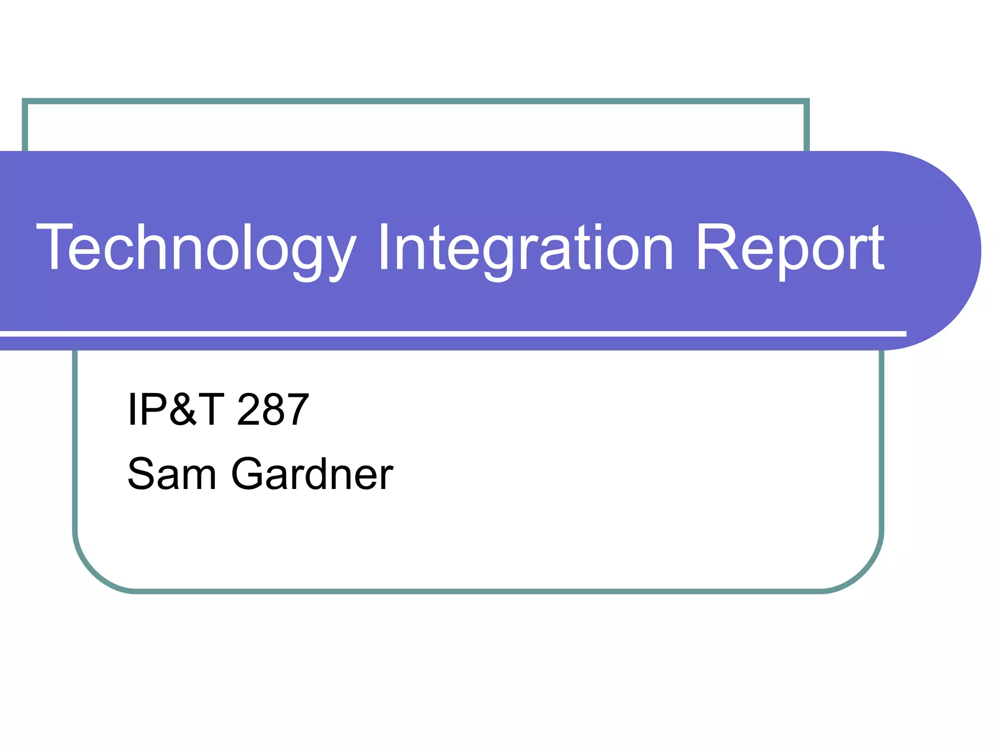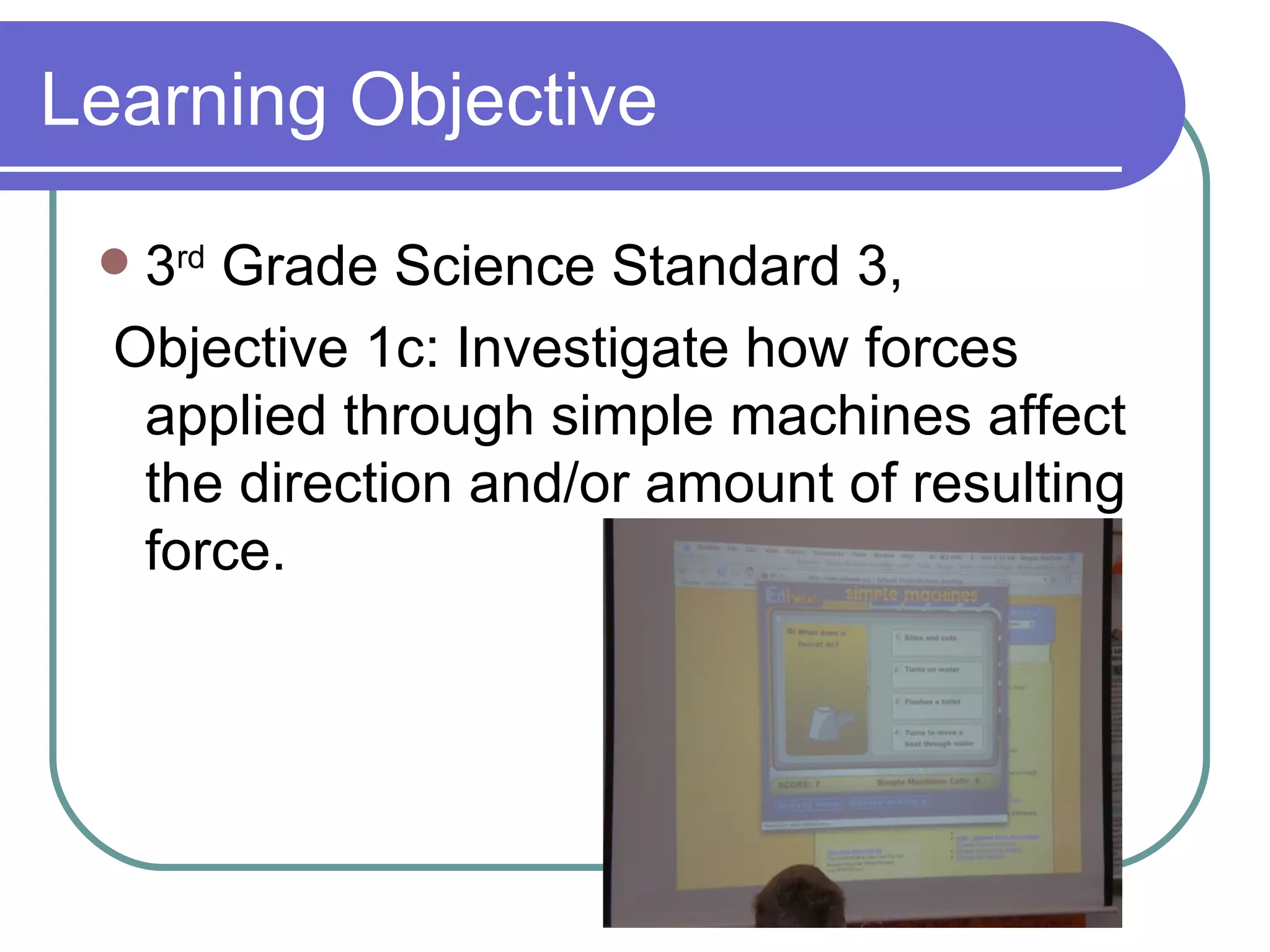 This technology integration report summarizes a 3rd grade science lesson that used a computer projector, microphone, and online game to teach students about simple machines. Students were able to choose which simple machine to learn about next using the computer. Each student could see the projected demonstrations and explanations of how simple machines work. The technology helped illustrate and reinforce the concepts by providing visual examples of how simple machines are found in everyday objects. It allowed individual student participation and engagement with the material.