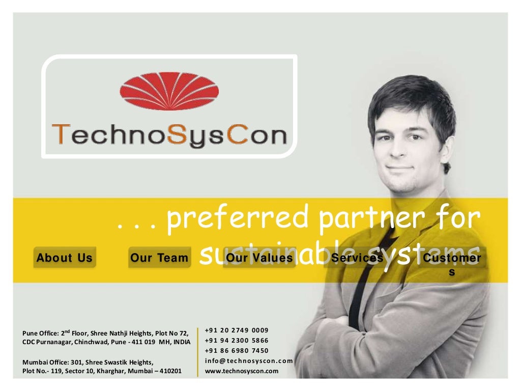 TechnoSysCon is a Management consultancy organization providing guidance for implementation & certification for ISO 9001, ISO 14001, ISO/TS 16949,OHSAS 18001, ISO/IEC 17025 (NABL), ISO 22000, ISO 50001, ISO 27001, ISO 20000, ISO13485, ISO 15189, AS 9100, TPM, TQM, GMP, CDM and related management systems. We have our esteemed customers from various sectors of industry like automotive, chemical, pharmaceutical, hotels, electronics, software and BPO. We also provide services for management systems development, certification & audits for a group of suppliers. Our core competency is into Integrated Management System Certification & NABL Accreditations.