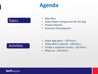 The document provides an agenda and overview for a market research lesson. It includes topics such as sharing app ideas, learning about video player components, conducting product market research, and customer development. Activities include brainstorming app ideas, taking a video tutorial on app components, creating a customer survey, and wrapping up. The lesson teaches concepts like conditionals, variables, procedures, and the importance of understanding customer needs to avoid startup failure. It provides examples of sample customer surveys and has students create their own survey and collect responses to analyze their potential app's market.