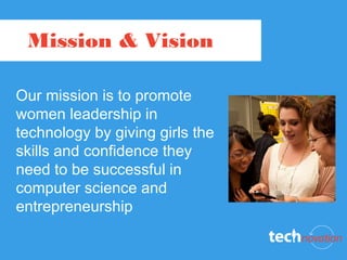 The document outlines Iridescent's mission to empower high school girls in technology through a mentorship program focused on mobile app development. Participants work in teams to create an app, pitch their ideas, and receive guidance from professional women in tech. The initiative aims to scale up and engage 200,000 girls annually, having already reached 800 girls and 200 mentors.