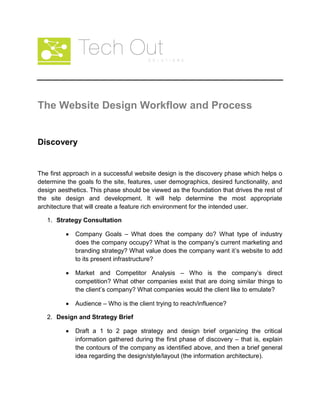 The document outlines the website design workflow process, which includes discovery, definition, design, development, and deployment phases. In the discovery phase, goals, features, users, and design are determined. Definition involves site mapping, content organization, and wireframes. Design encompasses visual elements and user experience. Development is coding the design. Deployment includes testing, launching, and submitting to search engines. The process aims to strategically plan websites to achieve goals.