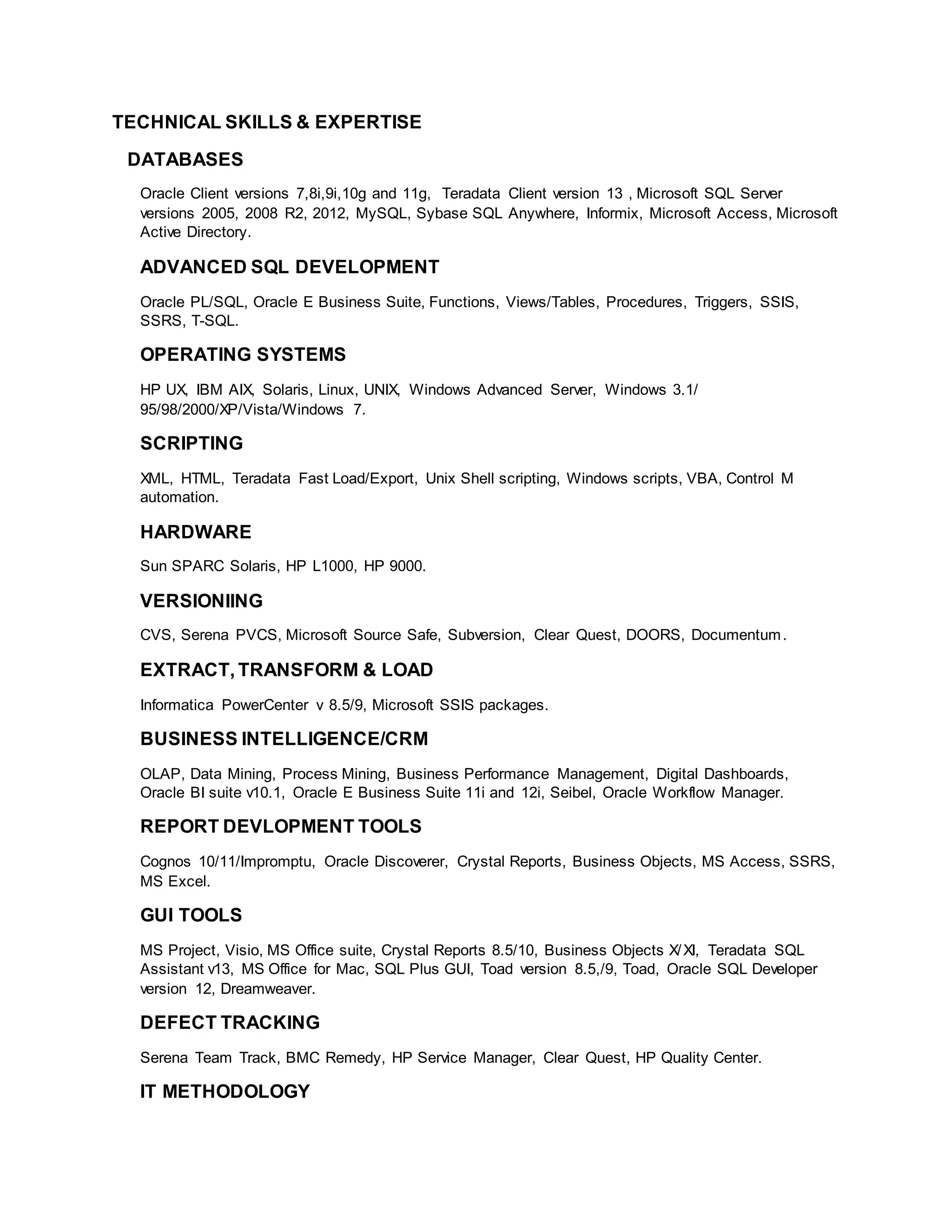 The document lists the technical skills and expertise of an individual including proficiency with databases like Oracle, SQL Server, MySQL, and Sybase. It also includes experience with SQL development, operating systems, scripting languages, hardware, version control systems, extract-transform-load tools, business intelligence/CRM software, reporting tools, GUI tools, defect tracking, IT methodologies, testing tools, and data modeling tools.