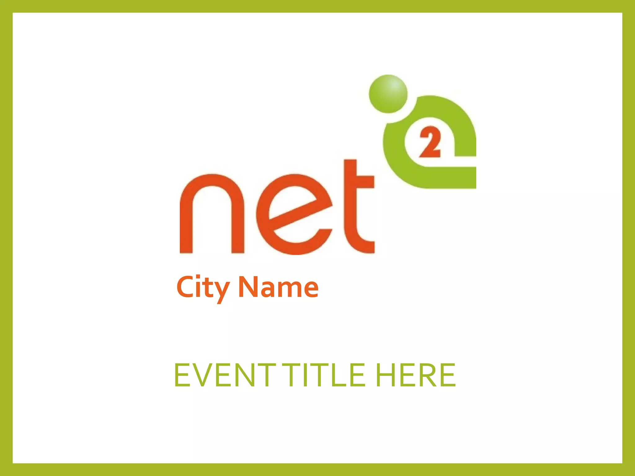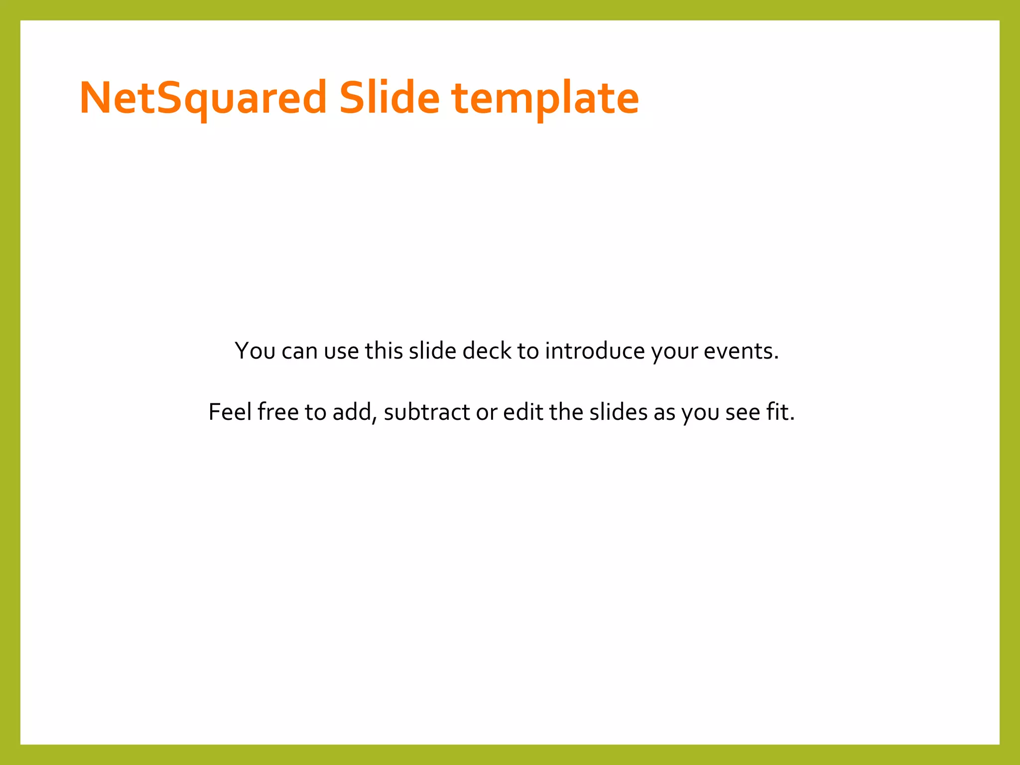 This slide deck is intended to introduce events for NetSquared, a program that organizes nonprofit technology meetups and training events to help nonprofits master technology. The slide deck provides information on NetSquared's mission and global network, offers ways for nonprofits to access donations and discounts on technology, and templates for promoting sponsors and featuring guest speakers at events.