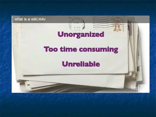 This document discusses using wikis and technology in teaching. It introduces wikis as a tool that allows users to collaboratively create and edit web pages without special software. Examples of wikis are shown and questions are asked about how teachers can use the faculty wiki to enhance their teaching, share what they teach, and have discussions. Guidelines are provided around digital citizenship and appropriate online behavior. A survey is also mentioned. In summary, the document promotes the use of wikis for collaboration between educators and discusses related topics like digital citizenship.