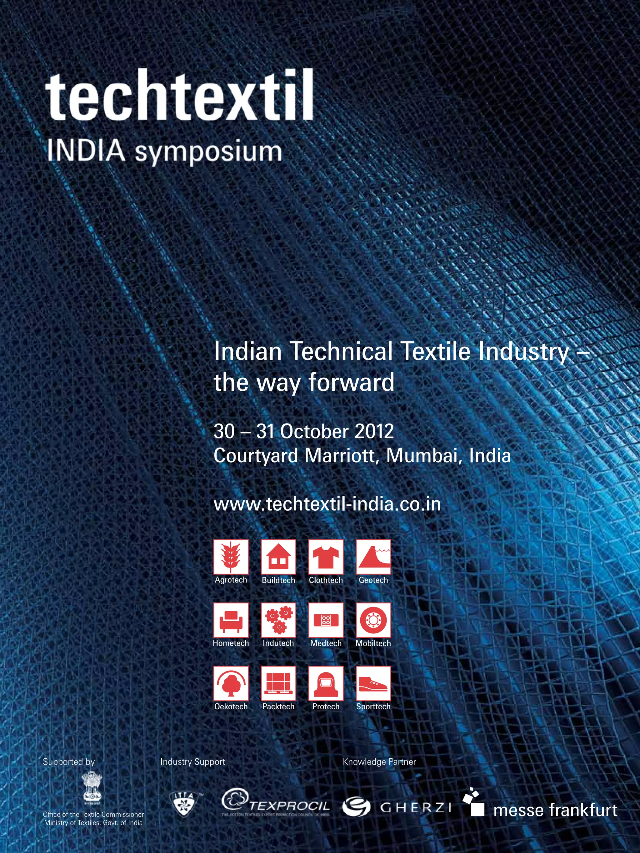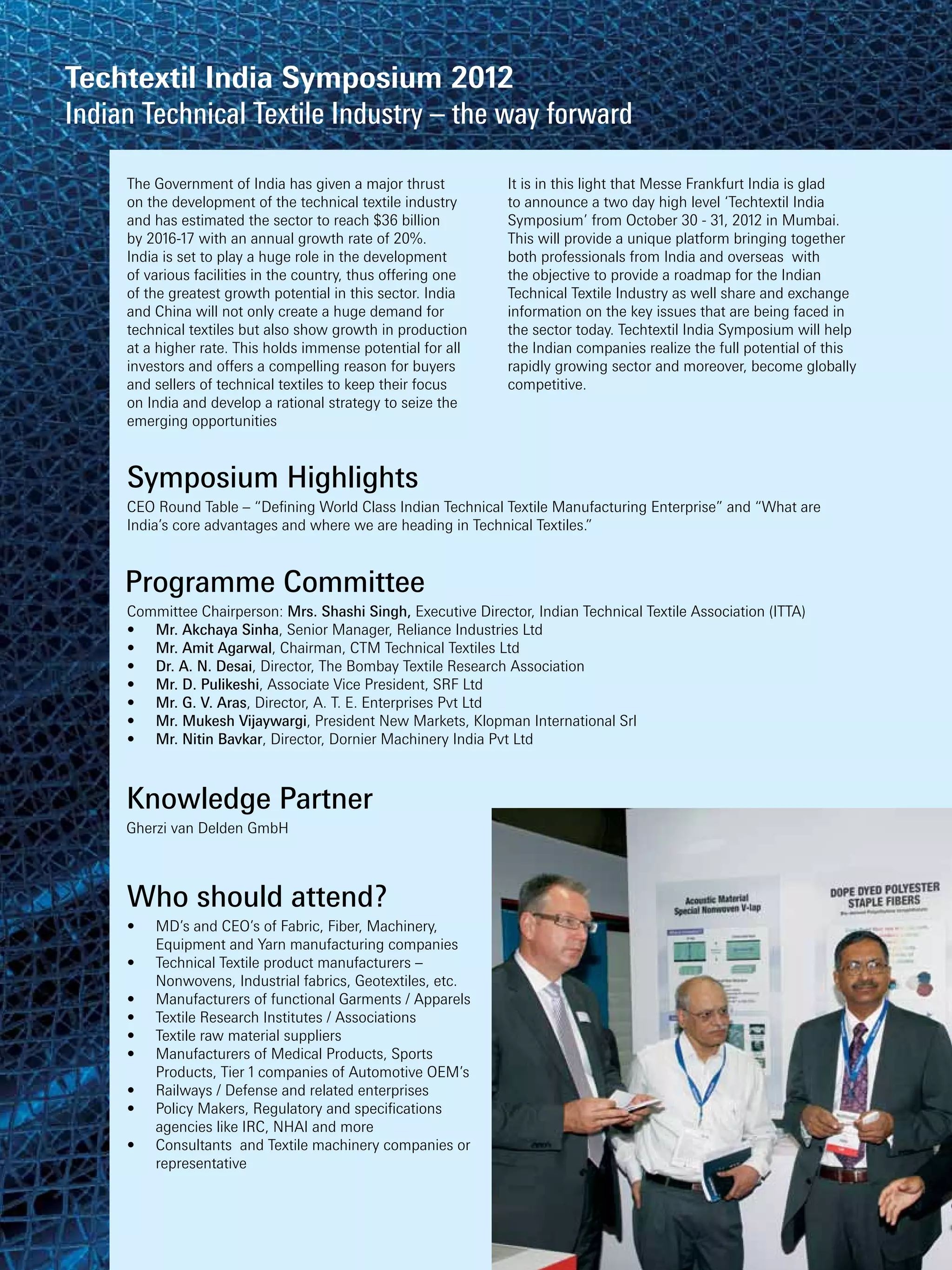 The two-day Techtextil India Symposium was organized in Mumbai to provide a platform for professionals from India and overseas to discuss opportunities and challenges in the Indian technical textile industry. The government of India has prioritized growing this sector and estimates it will reach $36 billion by 2016-17. The symposium aimed to help Indian companies realize the full potential of this growing industry and become globally competitive through CEO roundtables and sessions on global trends, success stories, technologies, raw materials, and visions for the future.