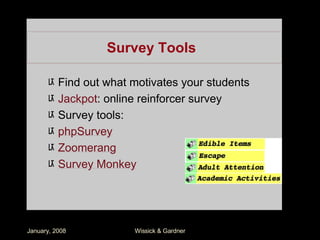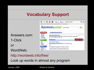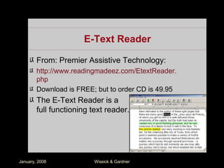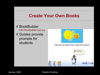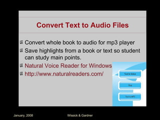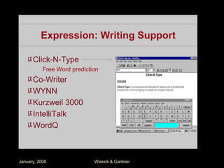 The document discusses how teachers can integrate technology-based learning activities into their curriculum using principles of Universal Design for Learning (UDL) to benefit diverse learners. It outlines various technology tools and methods that align with UDL principles to support engagement, presentation, and expression among students. Practical examples are provided for enhancing skills in reading, writing, communication, and mathematics through specific technology resources.