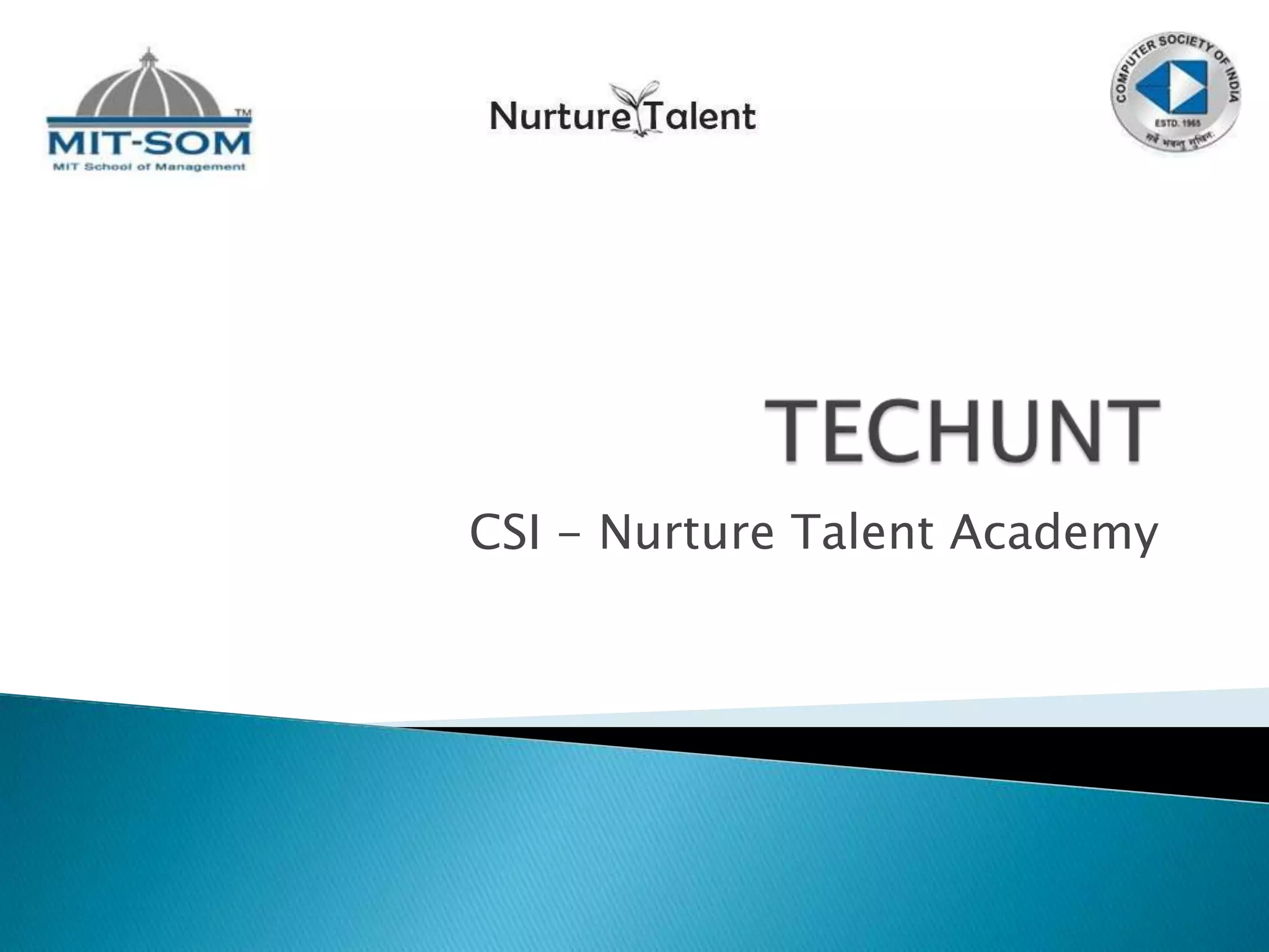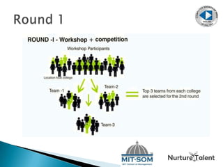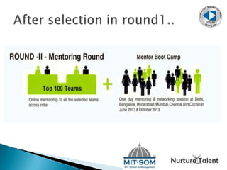 Nurture Talent Academy provides training and mentoring programs to help budding entrepreneurs start their own ventures. It helps students and startups convert ideas into viable businesses by teaching skills like business planning, finance, marketing, and technology. The document describes TECHUNT 2013, a program that trains and mentors technology students and professionals to become entrepreneurs by solving societal problems using technology and mobile applications. Students will learn skills like idea generation, Android development, mobile prototyping, and marketing to develop their own Android app and participate in a business competition.