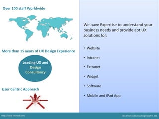 Techved is a leading UX and design consultancy that provides various services including competitor analysis in web space (CAWS). CAWS involves analyzing a client's website against competitors across four areas: user experience, features, SEO/Alexa ratings, and social media signals. The document outlines Techved's CAWS process and packages that provide reports, interpretations, solutions, and retrofit studies to help clients improve their online presence relative to competitors.