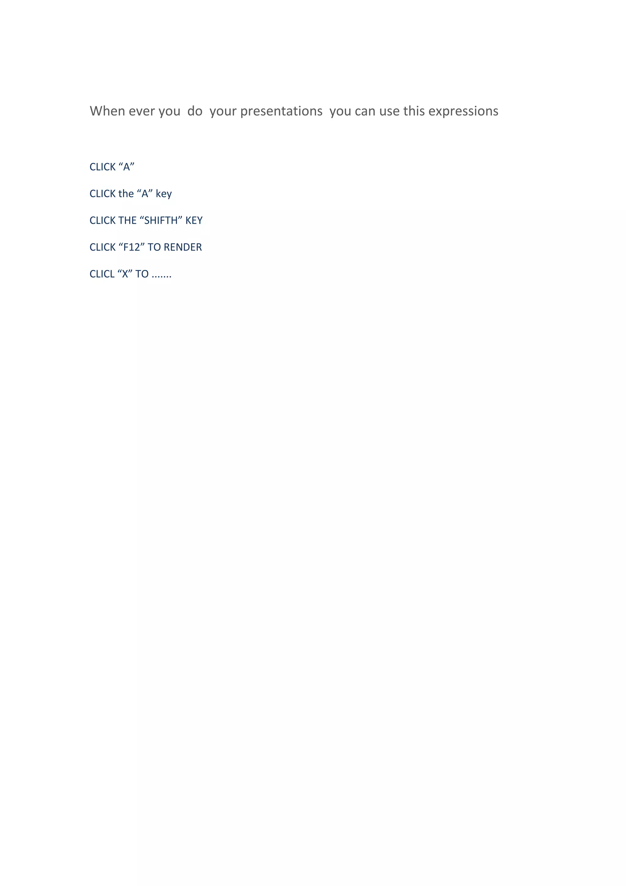 This document provides instructions for using keyboard shortcuts during presentations, including clicking the "A" key, clicking the "SHIFT" key, clicking "F12" to render, and clicking "X" to perform some unknown action.