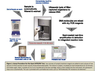 This document discusses techniques for diagnosing tuberculous meningitis. It describes direct diagnostic techniques that detect the causal agent and indirect techniques that detect the host's immune response. Adenosine deaminase (ADA) is an indirect diagnostic technique discussed in detail. ADA levels are often elevated in tuberculosis and other diseases. The document outlines the principle, definition, and determination of the ADA technique. Studies comparing ADA to polymerase chain reaction and examining ADA cutoff levels for diagnosing tuberculous meningitis in cerebrospinal fluid are summarized.