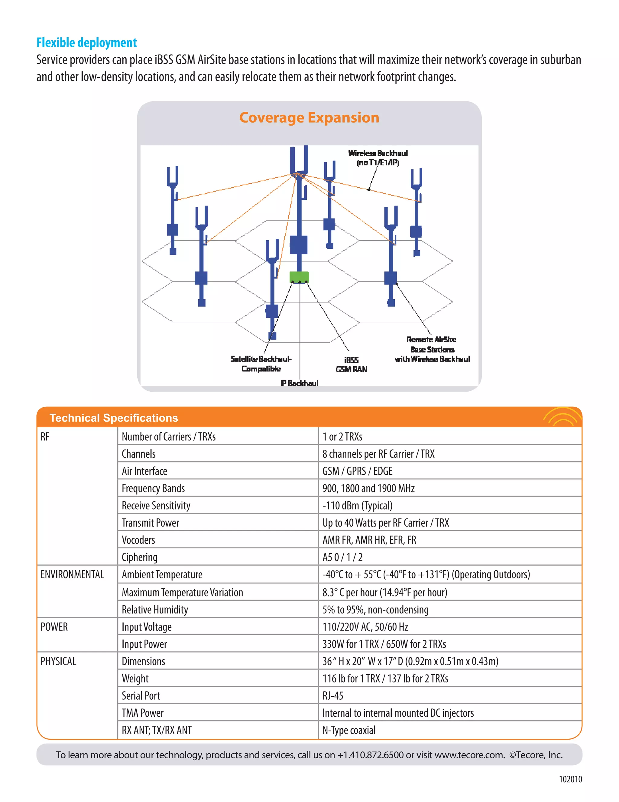 This document summarizes an integrated backhaul-free base station solution called the iBSS GSM AirSite BTS. The AirSite BTS eliminates the need for expensive backhaul connections like T1/E1/IP links by using in-band spectrum to carry traffic. It supports up to 12 full-power base stations from a single interconnect point, lowering backhaul costs. The compact and self-configuring AirSite stations provide similar coverage to conventional cells at a fraction of the cost and are easy to deploy in rural or difficult areas. When combined with other iBSS products, the AirSite extends GPRS/EDGE coverage without additional hardware.