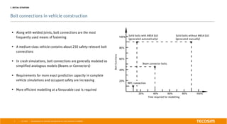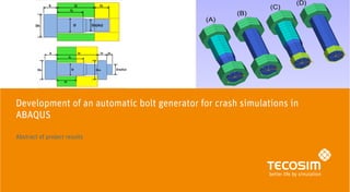 The document describes the development of an automatic bolt generator for crash simulations using Abaqus, aiming to improve the modeling of bolt connections in vehicle structures due to increasing demands for accuracy in safety predictions. The project includes programming a graphical user interface to facilitate the automatic generation of bolt models across various sizes and property classes, ensuring that results align with theoretical metrics. A validated material model with failure criteria was produced, allowing for efficient pre-loading calculations and positioning of bolts with minimal user input.