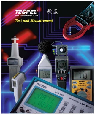 This document provides a summary of products offered by TECPEL co., LTD including precision LCR instruments, function generators, multimeters, and environmental testers. Their product line includes oscilloscopes, power supplies, multi-meters, thermometers, and more. They offer quality instruments for testing electric and electronic components across various parameter and application areas.