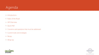 The document summarizes an agenda for an API development roundtable discussion. It introduces the speakers and establishes discussion rules. It then provides an overview of APIs, including their evolution, growth, use cases, security considerations, and adoption across industries. A quick poll is taken on companies' API maturity. Key concerns around API development like security, performance, and ownership models are discussed. Current tools and strategies used are reviewed. The document recaps the discussion and thanks participants.