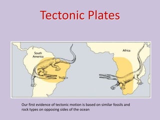 The document discusses evidence for tectonic plate movement. Similar fossils and rock types found on opposite sides of oceans provided early evidence. Today, plate boundaries are identified by the locations of volcanoes and earthquakes. Volcanoes result from the friction of plate movement, while earthquakes occur where plates rub against each other. Seafloor ages also provide evidence, as ages get younger approaching mid-ocean ridges. Plate types - oceanic and continental - and effects of plate tectonics such as seafloor spreading, volcanoes, earthquakes, and mountain formation are also outlined.