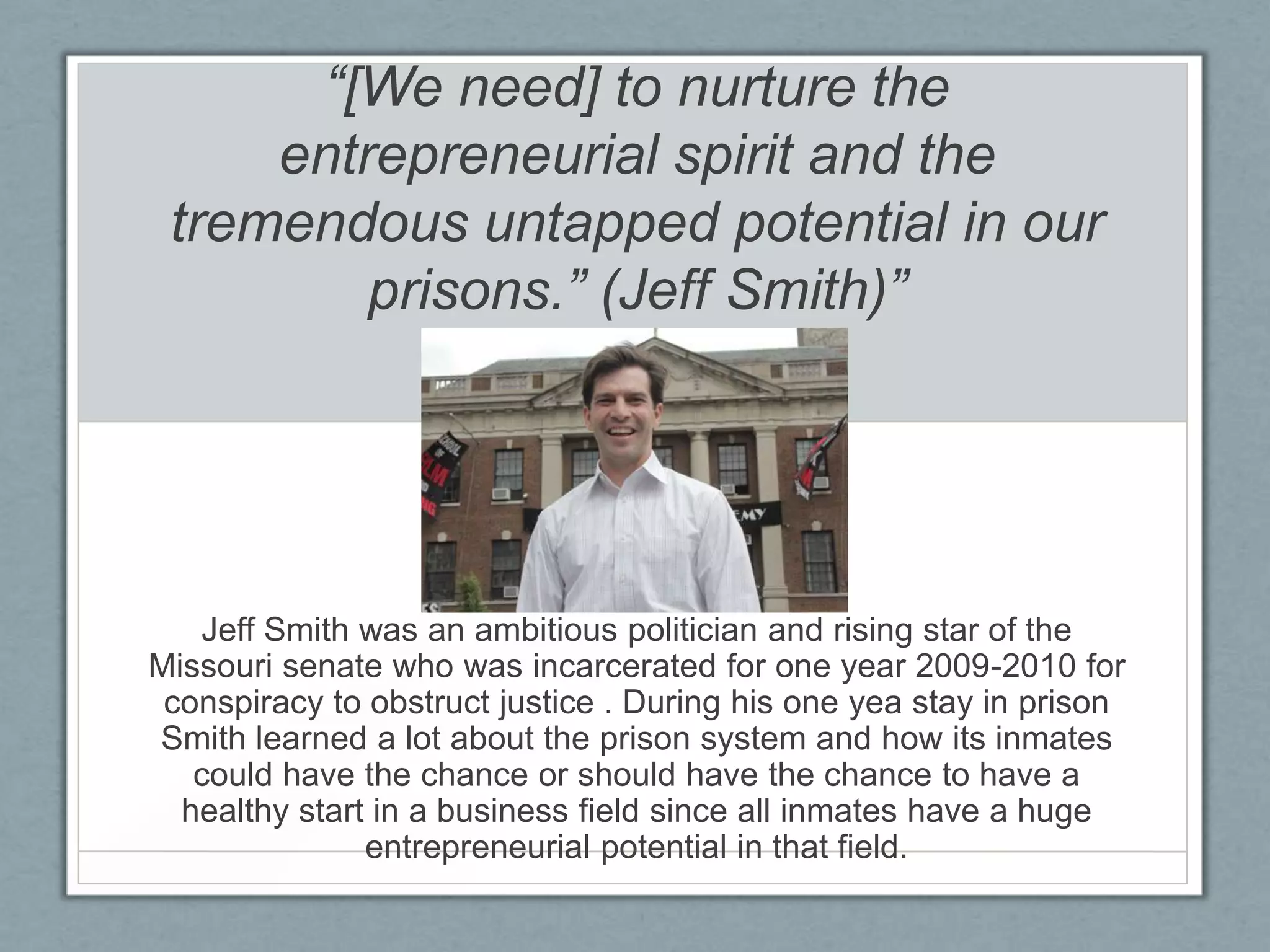 Jeff Smith was a rising politician in Missouri who was incarcerated for one year from 2009-2010. During his time in prison, he learned about the entrepreneurial potential of inmates. In his TED Talk, he argued that prisons should provide opportunities for inmates to develop business skills and nurture their entrepreneurial spirit. He maintained audience engagement by comparing business in prison to the real world and providing examples from his own experience. He followed two of the TED Commandments by using stories from his time in prison to effectively share his message and keep the audience interested.