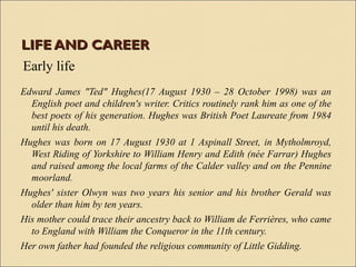 Ted Hughes (1930-1998) was a renowned English poet and children's writer who served as British Poet Laureate from 1984 until his death. He grew up in Yorkshire and was encouraged in his writing from a young age by teachers. Hughes met and married American poet Sylvia Plath in 1956 after publishing his first poems. Their marriage was tumultuous and ended with Plath's suicide in 1963. Hughes had a successful career publishing poetry collections that explored themes of nature and violence. He was appointed Poet Laureate in 1984 and continued writing until his death, including breaking his silence about Plath in his final collection Birthday Letters.
