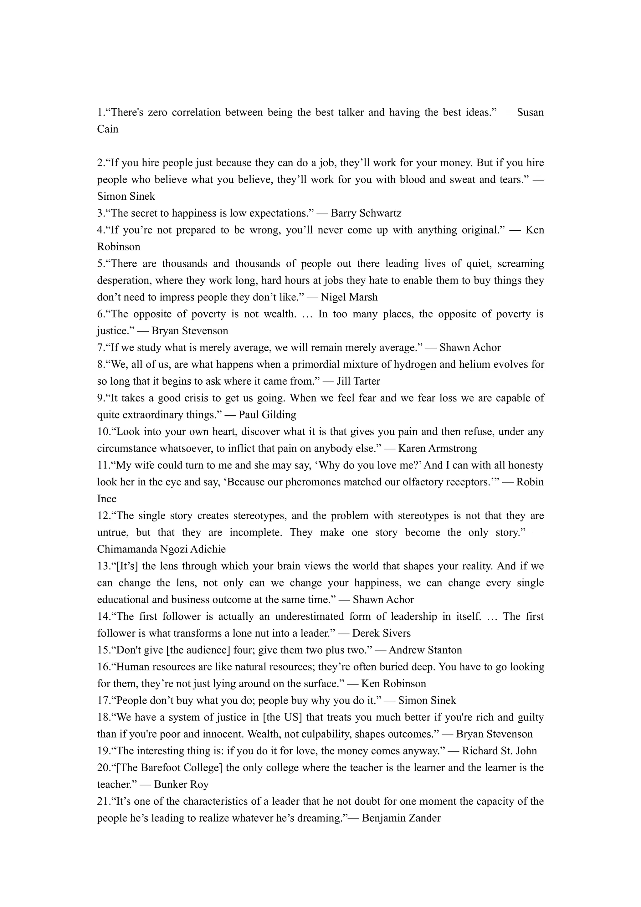 The document contains quotes and sayings from various people on a variety of topics such as leadership, education, happiness, justice, creativity, and more. Some of the key ideas expressed are that true leadership inspires people through shared beliefs rather than just employment, low expectations can lead to greater happiness, changing one's lens or perspective can change outcomes, and that wealth should not determine justice.