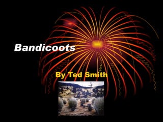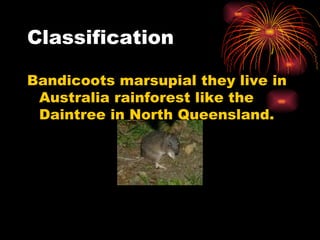 Bandicoots are marsupial rats found in Australian rainforests, they come in many colors, shapes and sizes and have large ears, bodies and tails; they live on the forest floor in burrows, eat spiders, worms and insects as well as roots, and can be aggressive when mating, giving birth to 2-4 young.