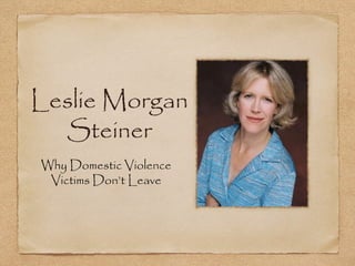 The document summarizes Leslie Morgan Steiner's Ted Talk on why domestic violence victims don't leave. It notes that Steiner captured the audience's attention by sharing her personal experiences with domestic violence and was able to maintain their attention through humor and emotional points. The document also analyzes how Steiner's talk followed Ted Talk conventions like telling a story and relating a personal triumph to make her message credible.