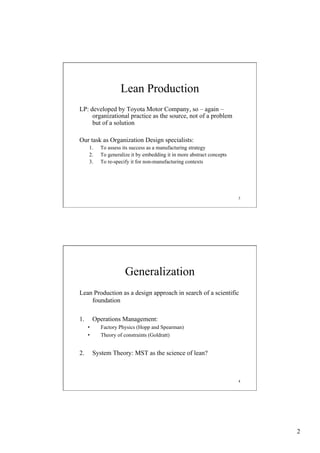 2. Lean can be generalized by embedding it in more abstract concepts from fields like operations management and systems theory. MST may provide a scientific foundation for lean as the science of lean production design principles.