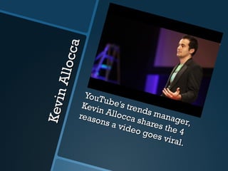 1. Kevin Allocca, the manager of YouTube trends, presented on why videos go viral.