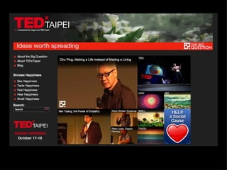 ![[4 speakers] [12 open space topics] [150 attendants] [2 days of brainstorming and idea creation] Em pathy Yo ur Choice Ro admap Ma king a life](https://image.slidesharecdn.com/tedprizeed2-090228191048-phpapp01/85/TEDx-Taipei-Launch-2009-2-320.jpg)