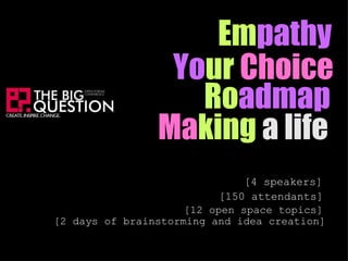 This document summarizes a two-day conference with 4 speakers and 12 discussion topics that was attended by 150 people. The conference, called The Big Question 2008, focused on topics like empathy, choice, roadmapping, and happiness. It also included a screening of a TED talk by Sylvia Earle on protecting the oceans and calls for people to help spread TED ideas through hosting events, translation, and spreading the word.