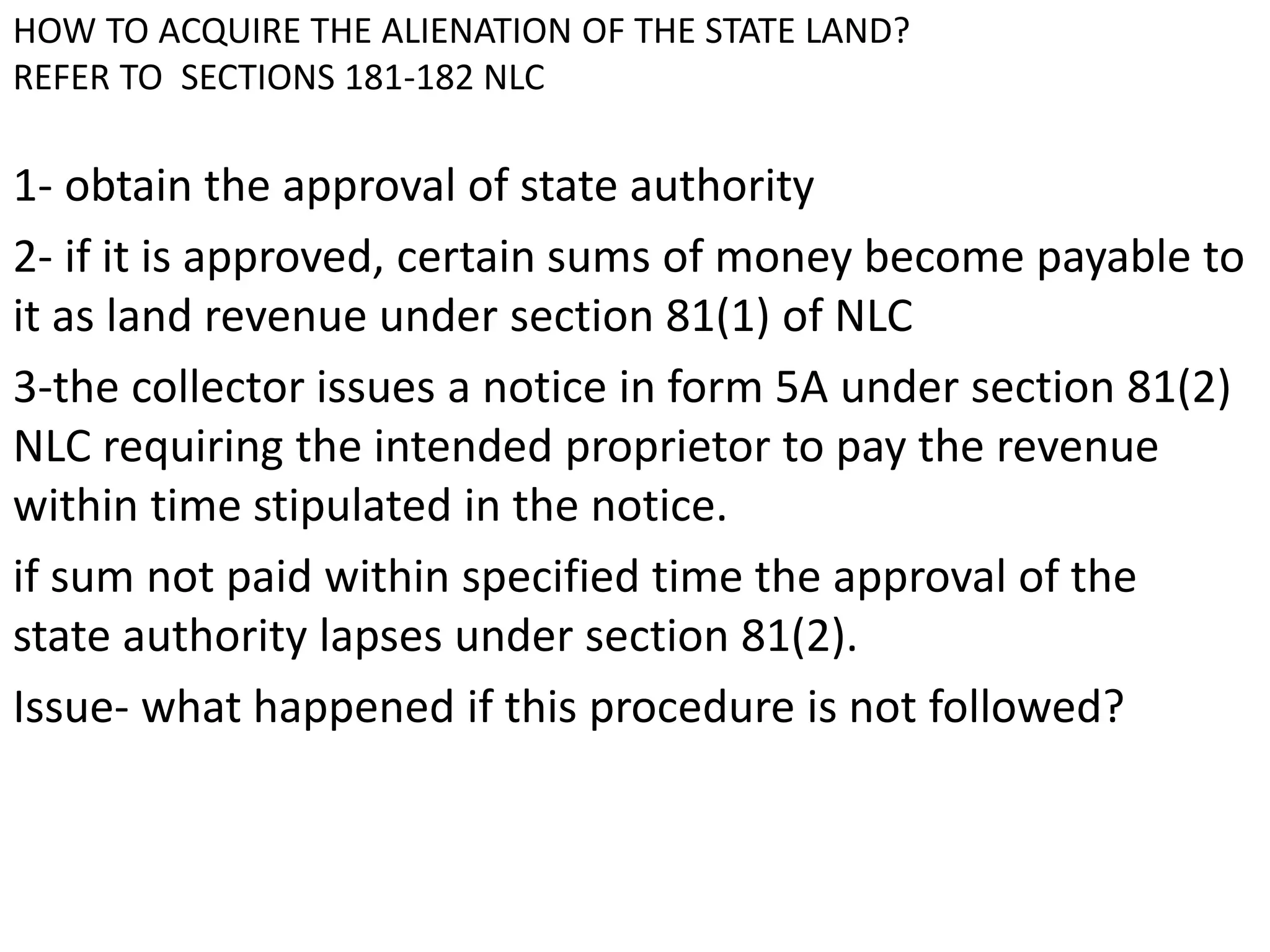 This document discusses the procedure for acquiring state land under the National Land Code (NLC) of Malaysia. It summarizes a court case where an applicant paid the land revenue amount 8 months after the specified deadline in the notice. A third party challenged the alienation, arguing the approval had lapsed. However, the court held that the state authority accepting late payment implied a fresh approval. The decision showed that paying land revenue within the deadline is not mandatory under NLC, and the registration of title is the primary consideration in establishing ownership of the land.