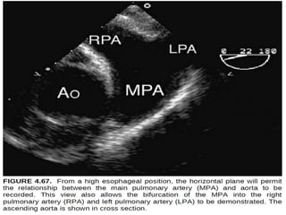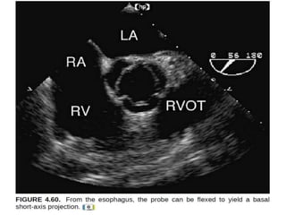 Transesophageal echocardiography (TEE) provides high-quality ultrasound images of the heart by utilizing the proximity of the esophagus, enabling detailed assessment of cardiac conditions such as thrombi and valve diseases. The procedure involves proper patient preparation, real-time monitoring, and specific imaging techniques to visualize various heart structures, with minimal risks and contraindications. TEE is particularly safe for critically ill patients and is essential for intraoperative monitoring and diagnosis of cardiac anomalies.
