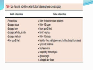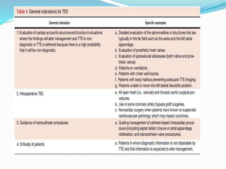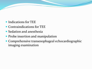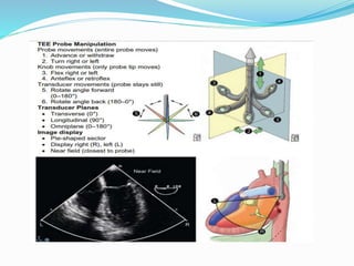 This document provides guidance on performing a comprehensive transesophageal echocardiography (TEE) examination including standard imaging plane levels and views. It describes how to obtain standard mid-esophageal (ME) views such as the five-chamber, four-chamber, and two-chamber views as well as transgastric (TG) views including the basal short-axis, midpapillary short-axis, and apical short-axis views. Each view is defined by the structures seen and clinical applications. Probe manipulation techniques including adjustments to transducer angle and position are outlined to transition between views for a systematic TEE exam.