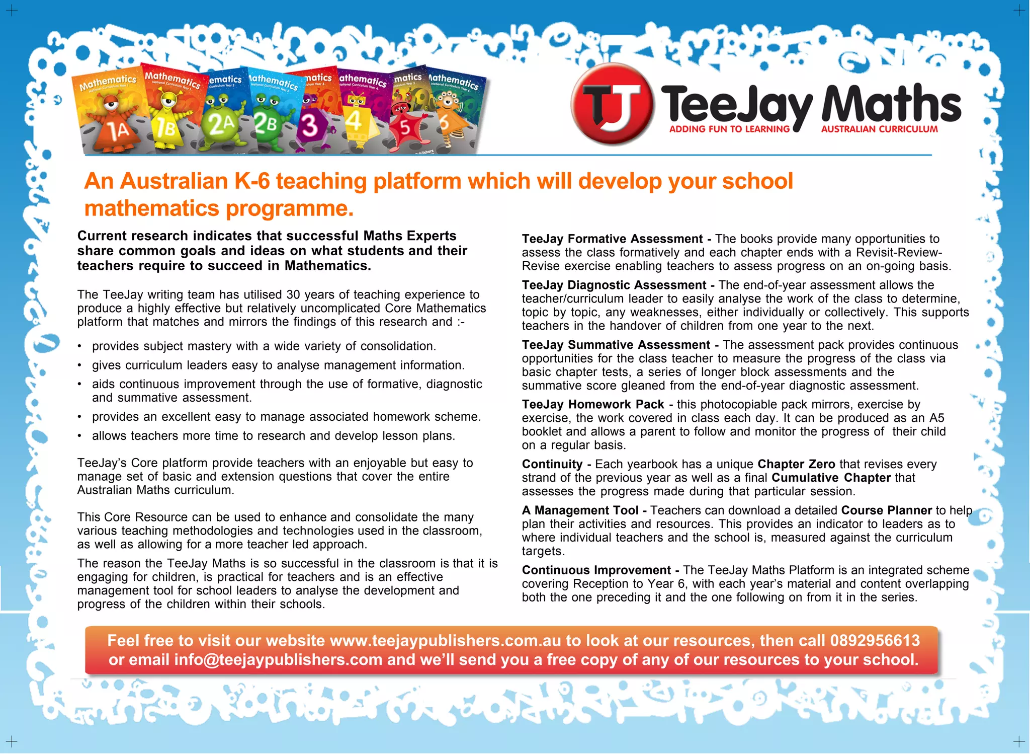 The document introduces a K-6 mathematics teaching platform in Australia designed to enhance school math programs based on current research and 30 years of teaching experience. It offers various assessment tools, management resources for teachers, and a comprehensive curriculum covering the entire Australian maths syllabus. Through engaging materials and structured support, the platform aims to facilitate continuous improvement in student learning and teaching methodologies.