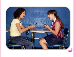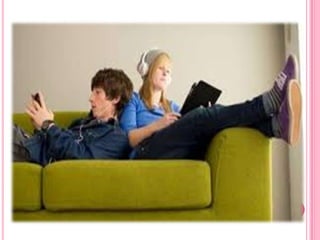 This document provides an overview of topics related to teenagers, including their relationships with family, society, communication, food, sleep, technology, crime, drugs, peer pressure, fashion, and love. Some key points include how teens spend less time with family as peer relationships become more important, common reasons for conflict between teens and parents, ways teens communicate including texting and social media, and the influence of fashion and peer pressure on teen identity and behavior.