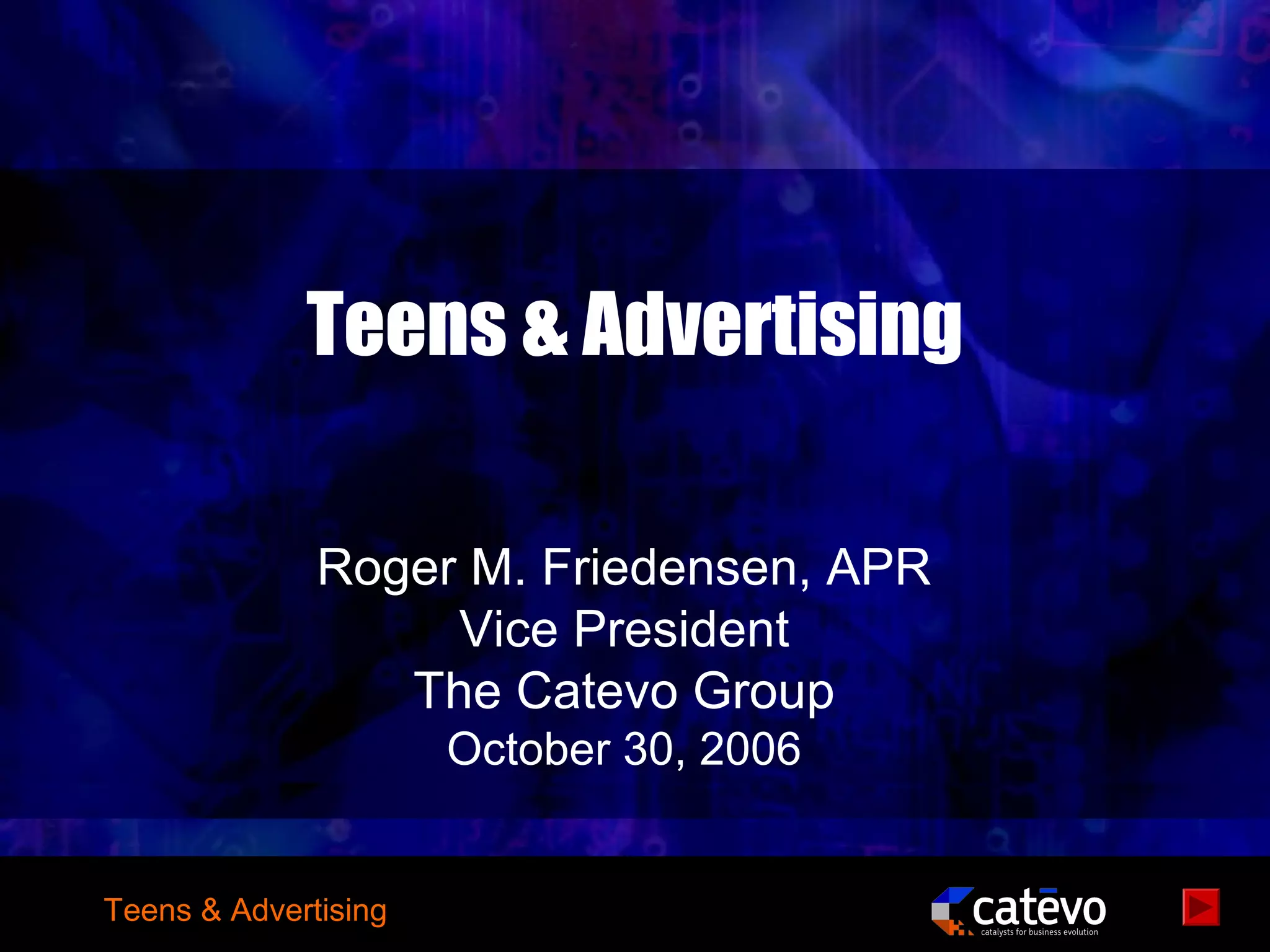 The document discusses teens and advertising. It notes that advertisers spend over $15 billion to reach the 32 million teens in the US, who have $233 billion in income and influence over $600 billion in spending. Advertising works on teens by capturing their attention through repetition and appealing to their motivations to be cool, fun, popular and feel good. However, today's teens are more networked, interactive and focused on self-expression through social media than older generations. This means brands need to offer more user-designed and personalized experiences to appeal to teens.