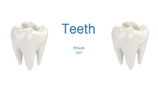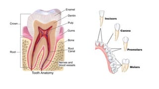 Teeth are small, calcified structures found in the mouth that mechanically break down food. They are composed of materials like calcium, phosphorus, and enamel. There are four main types of teeth - incisors for cutting, canines for tearing, premolars for crushing, and molars for grinding food. Plaque buildup can lead to tooth decay from bacteria like Streptococcus mutans producing acid that dissolves enamel over time. Proper oral hygiene through brushing teeth twice daily and regular dental checkups can prevent dental issues.