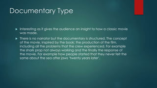 The documentary provides insight into the making of the classic film Jaws by profiling the production challenges, including mechanical issues with the shark prop, without a narrator. It structures interviews with the crew about transforming the book into a film and the audience response which left many afraid to swim in the ocean afterwards. Shots include a blue screen with a cartoon shark projection, movie posters, and locations from the film on Martha's Vineyard that capture the experience of creating this influential blockbuster.