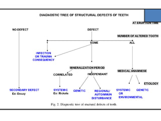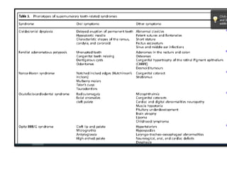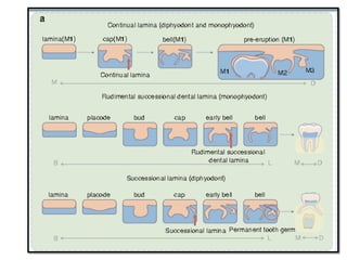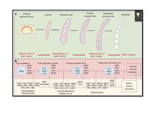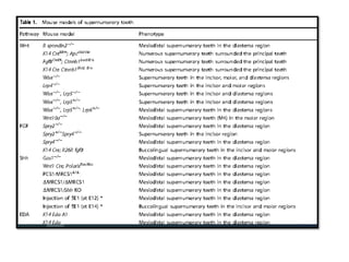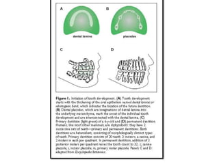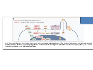 This document discusses genetic factors that influence tooth development abnormalities. It begins by describing the normal development of primary and permanent dentition, regulated by signaling centers. Tooth agenesis and supernumerary tooth formation can result from mutations affecting genes in the Wnt, BMP, Shh, and FGF signaling pathways. Specific syndromes associated with tooth number anomalies like ectodermal dysplasia and cleidocranial dysplasia are also discussed. The document concludes by covering variations in tooth size and shape, including double teeth formed by fusion or gemination, taurodontism, and other dental anomalies.