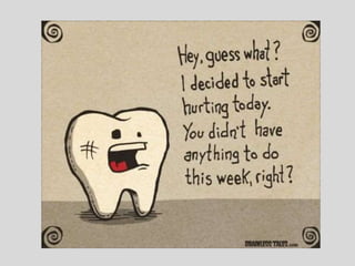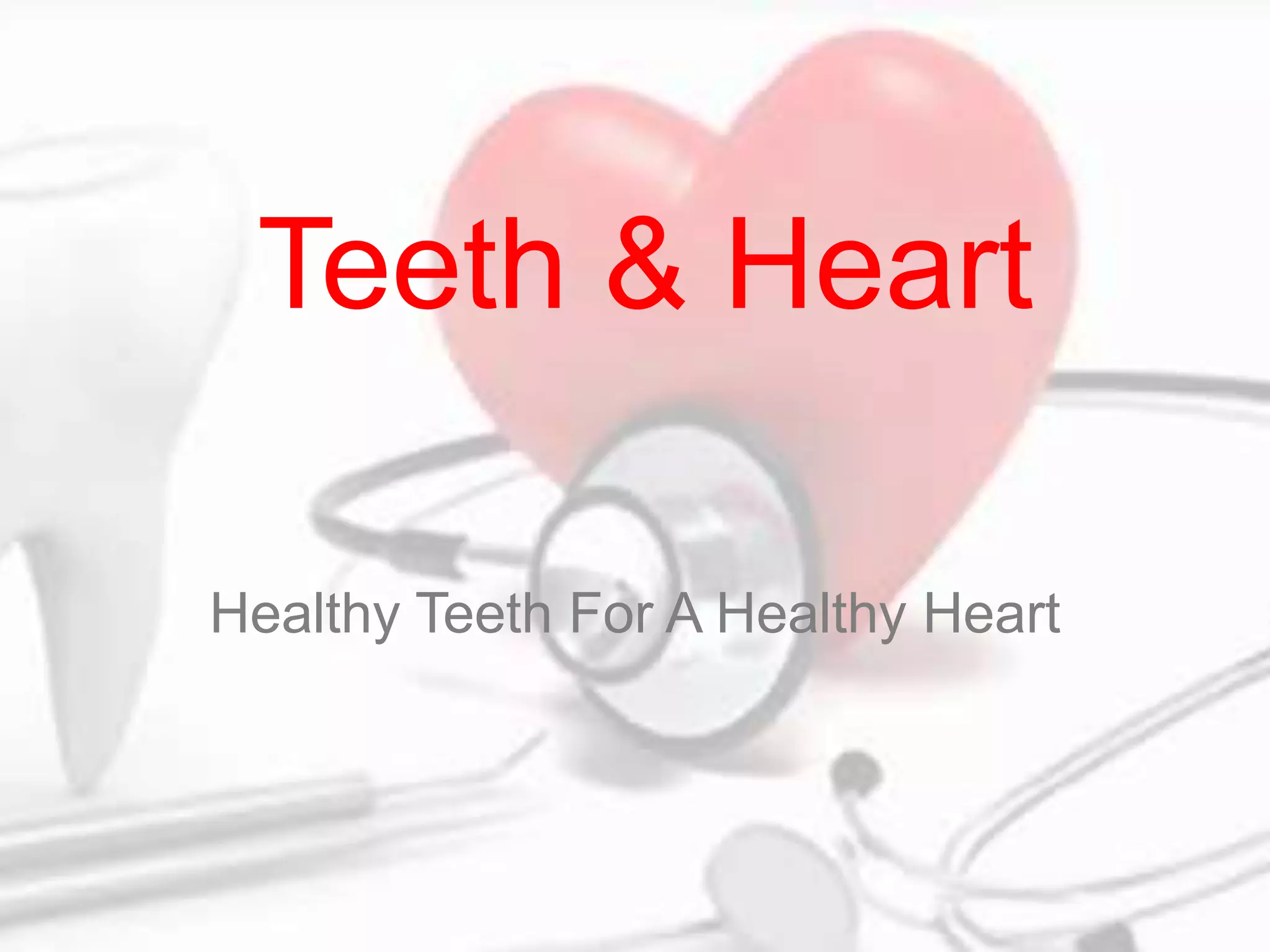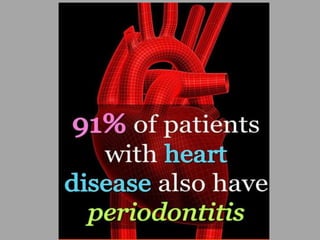 This document discusses the connection between oral/dental health and heart health. It notes that gum disease is linked to an increased risk of heart disease, as bacteria from gum disease can enter the bloodstream and trigger thickening of the arteries. Maintaining strong gums through regular brushing and flossing can help prevent both gum disease and heart disease. The document also discusses other oral health issues like bad breath, tooth decay, dry mouth, oral cancer, and links between gum disease and rheumatoid arthritis. It emphasizes the importance of good oral hygiene and dental care throughout life.