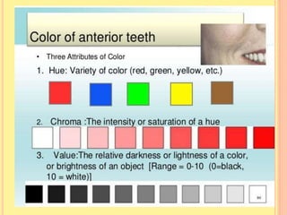 Teeth selection for complete dentures involves considering several factors to ensure function and aesthetics. Size is based on facial measurements and residual ridge contours. Form depends on facial profile, sex, age and personality. Color should harmonize with complexion. Anterior teeth material is typically porcelain or acrylic. Posterior teeth shade matches anterior teeth and form depends on occlusion type. Anatomic teeth are more aesthetic but non-anatomic teeth are more comfortable in resorbed ridges. Proper teeth selection improves denture function and patient confidence.