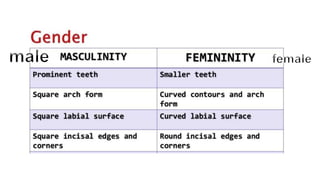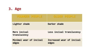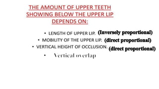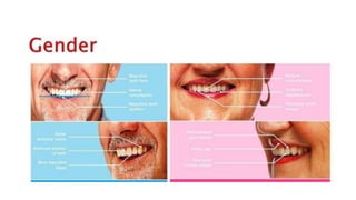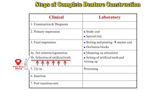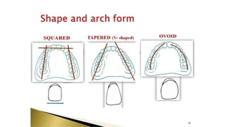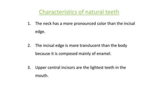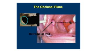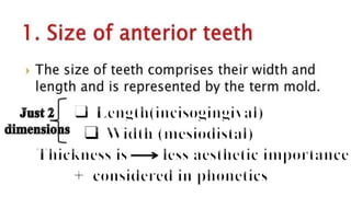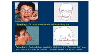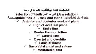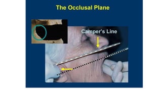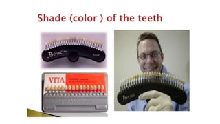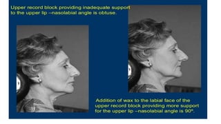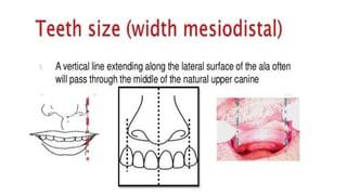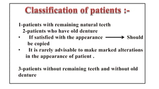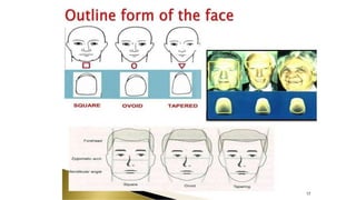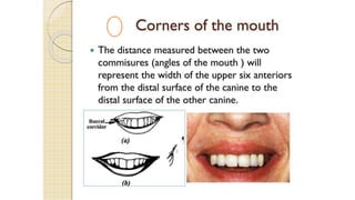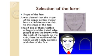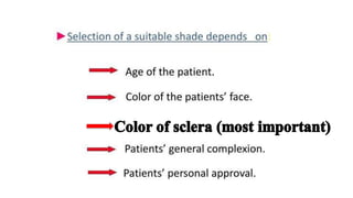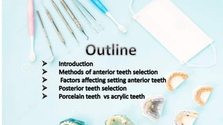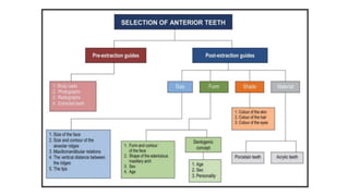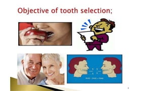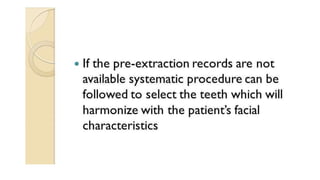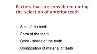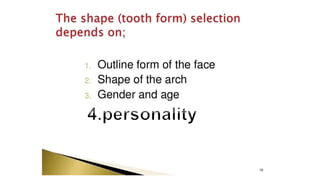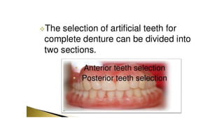 The document discusses the selection of teeth for complete dentures, emphasizing the importance of the physiologic rest position and its impact on occlusal rims. It provides clinical suggestions such as moistening the shade guide, positioning the teeth relative to the upper lip, selecting teeth under natural light, and considering the overall facial appearance during selection. These factors are crucial for achieving an aesthetically pleasing and functionally effective denture.