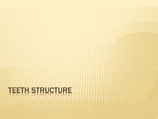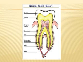 The document describes the anatomical structure of teeth. Teeth have several parts - the root embedded in the jaw, the crown visible in the mouth, enamel forming the hard outer layer, dentine forming the bulk, pulp containing blood and nerves, and cementum covering the root. Surrounding structures include the periodontal ligament attaching the tooth to bone, oral mucosa lining the mouth, gingivae protecting the bone and roots, and nerves and blood vessels supplying the tooth. Cavities are holes that grow over time in the enamel and dentine if not repaired. Cavities are classified depending on their location such as in fissures, between teeth, or near the gums.