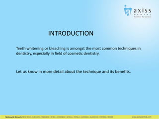 Teeth whitening is a popular cosmetic dentistry technique that utilizes oxidizing agents like hydrogen peroxide to lighten the shade of adult teeth. There are two primary methods: professional dental clinic bleaching and at-home bleaching, each with varying effectiveness and duration of results. Benefits include improved cosmetic appearance and an enhanced smile, while drawbacks include limited effectiveness on specific dental conditions and inconsistent results with at-home methods.