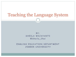 The document discusses various approaches to teaching language systems, including deductive and inductive approaches. It also discusses methods for explaining meaning, language construction, and providing practice and correction. Some key teaching methods include using visual aids to explain meaning, demonstrating intonation patterns, using flashcards, repetition for practice, and correcting errors carefully without being intrusive.