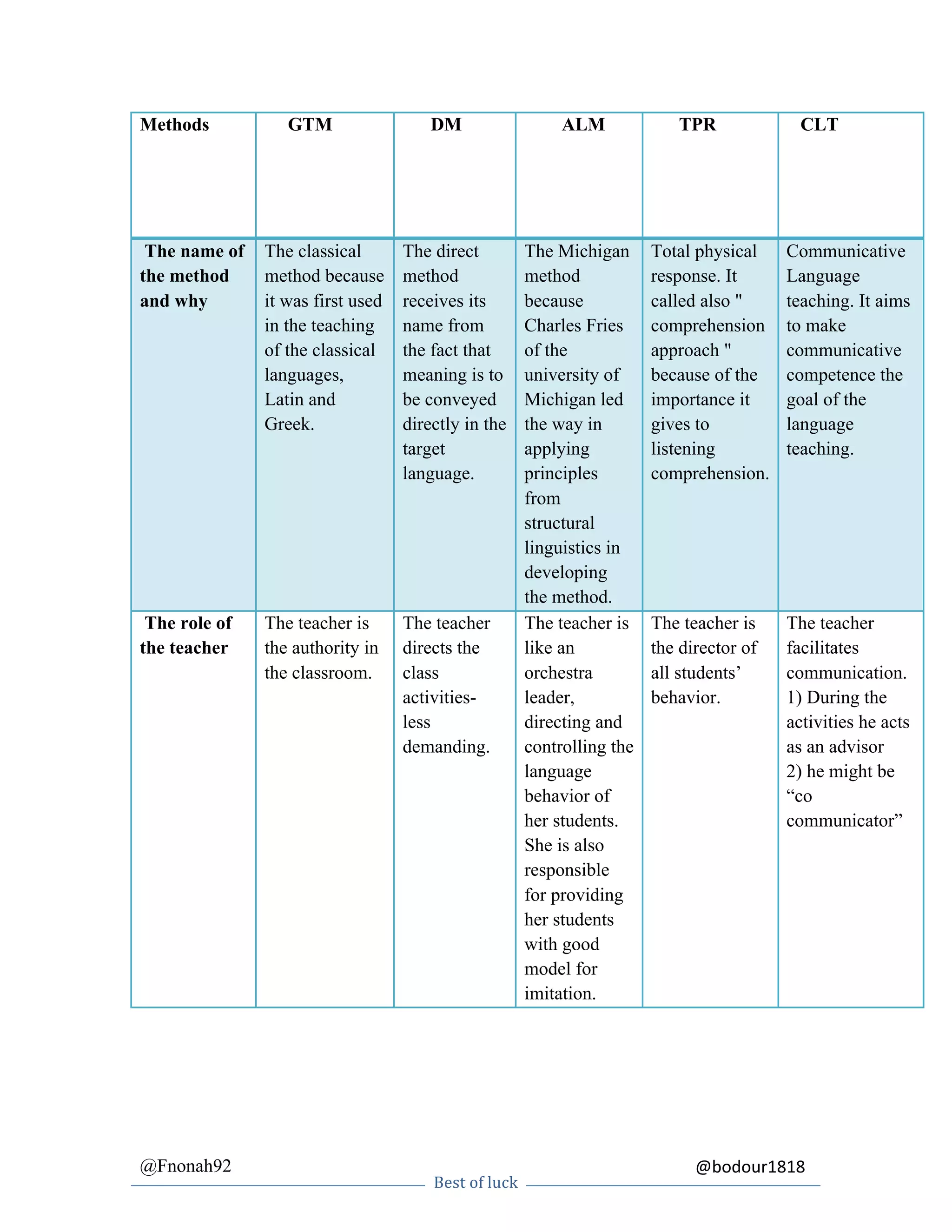 This document summarizes and compares several language teaching methods: the Grammar Translation Method, Direct Method, Michigan Method, Total Physical Response, and Communicative Language Teaching. For each method it provides details on the name and origins, the role of the teacher and students, the nature of interaction, how grammar is taught, the use of students' native language, error correction approach, evaluation techniques, and classroom techniques/activities.