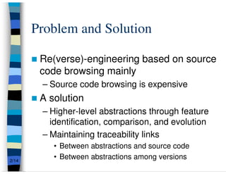 This presentation summarizes research on feature traceability in object-oriented programs. It was presented at TEFSE 2005 in Long Beach, USA on November 8th. The presentation discusses identifying features through static and dynamic code analysis, visualizing large numbers of program entities and features, and analyzing how features and architectures evolve across software releases using Mozilla and Firefox as an example.