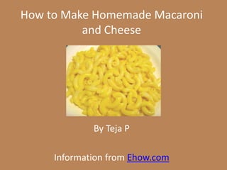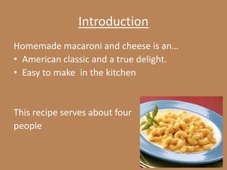 This document provides instructions for making homemade macaroni and cheese. It lists the ingredients needed which include penne pasta, butter, onion, white pepper, flour, mustard, milk and cheddar cheese. The instructions explain how to boil the pasta, make a cheese sauce by melting butter and cooking onion and flour before adding milk and simmering, then mixing the cooked pasta and sauce with additional cheese and baking until golden brown.