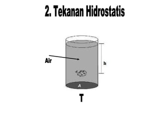 Dokumen tersebut membahas tentang fluida dan tekanan. Fluida adalah zat yang dapat mengalir seperti cairan, udara, dan gas. Tekanan adalah besarnya gaya yang bekerja pada suatu permukaan. Hukum Pascal menyatakan bahwa tekanan yang diberikan pada fluida akan tersebar merata ke segala arah.