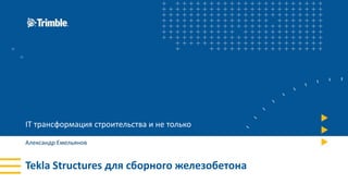 Документ описывает использование Tekla Structures для моделирования сборного железобетона и управления строительством. Рассматриваются технологии Trimble Connect и Tekla Model Sharing, которые обеспечивают эффективное сотрудничество команды и актуализацию данных. Также акцентируется внимание на организационном контроле модели и управлении проектной информацией.