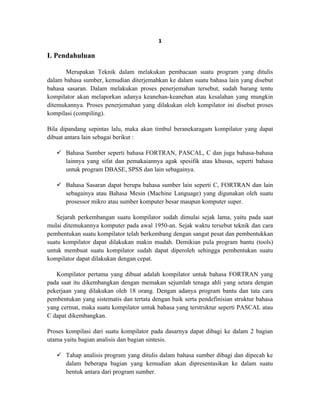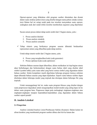 Dokumen tersebut membahas tentang proses kompilasi bahasa pemrograman, yang terdiri dari empat tahap utama yaitu analisis leksikal, analisis sintaktik, analisis semantik, dan sintesis. Analisis leksikal berfungsi untuk mengubah program sumber menjadi token, analisis sintaktik mengidentifikasi struktur program, analisis semantik memeriksa kesesuaian struktur, dan sintesis membentuk kode yang dapat dijalankan.