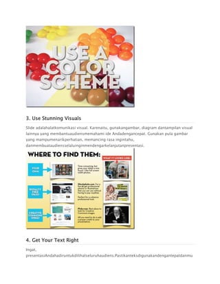 3. Gunakan visual seperti gambar dan diagram untuk membantu audiens memahami ide dengan cepat serta gambar yang menarik perhatian.